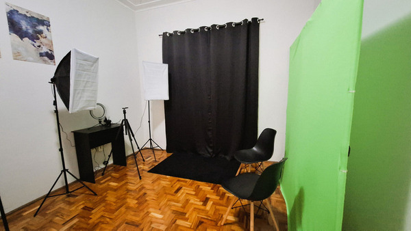 Estúdio completo com iluminação e fundo infinito, ideal para gravações e ensaios.